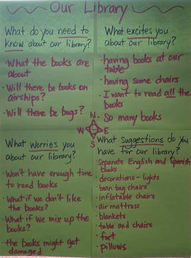 To invite children into the decision-making process when setting up our library, the 2nd grade students and I discussed their ideas and feelings about the classroom library, using a series of questions designed to guide their thinking process.