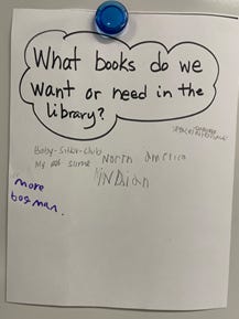 Can we get….? and Can we get more…? questions began to permeate the classroom. To capture this thinking, I posted a sheet for students to record what they wanted or felt we needed in our library. On the first day, Baby-Sitters Club, My Pet Slime, and more Dogman led the fiction choices, with Space, Astronauts, and the DK book of North American Indians holding the top places for nonfiction reading topics.